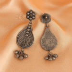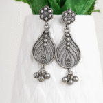 These exquisite antique silver drop earrings showcase the timeless beauty of traditional Indian craftsmanship. The design features an intricate floral top with a delicate star pattern surrounded by beaded details, flowing into an elegantly carved teardrop-shaped pendant. The oxidised metal finish gives these earrings a vintage charm, while the detailed line work creates a stunning dimensional effect. Each earring is adorned with charming dangling beads at the bottom, adding a subtle touch of movement and grace. The earrings perfectly balance traditional aesthetics with contemporary wearability, making them versatile enough for both festive occasions and everyday ethnic wear. The oxidised finish requires minimal maintenance and develops a beautiful patina over time. These statement pieces are ideal for pairing with traditional Indian outfits, particularly those featuring rich textures and embroidery. The lightweight design ensures comfortable wear throughout the day, while the secure fastening keeps them safely in place.